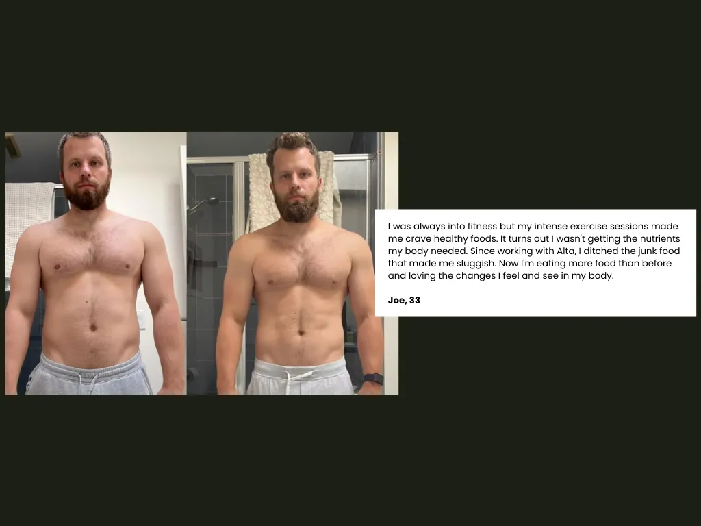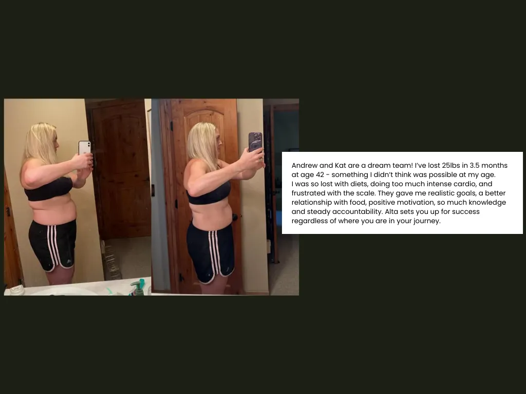 Andrew first met Kat when she became the nutrition coach for him and his wife. She helped Andrew handle issues with high cholesterol and gut health, and she helped Andrew's wife with weight loss and hormone balancing after becoming a Mom. He was so impressed with Kat's coaching he decided to partner with her to form Alta. Now it's Andrew's mission to show anyone that no matter how busy they are, they can find time to prioritize their own health. Whether it's focusing on weight loss, muscle gain, or gut health, Andrew wants everyone to know that self-care is family care.