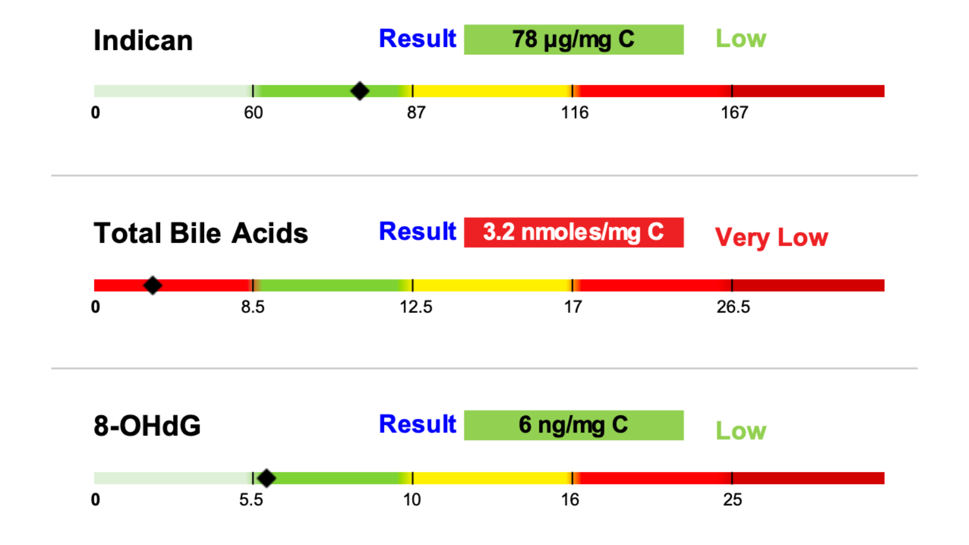 Total Bile Acids: Indicates liver and gallbladder function, bile flow, and fat digestion. Elevated levels may reflect sluggish bile excretion or liver stress.