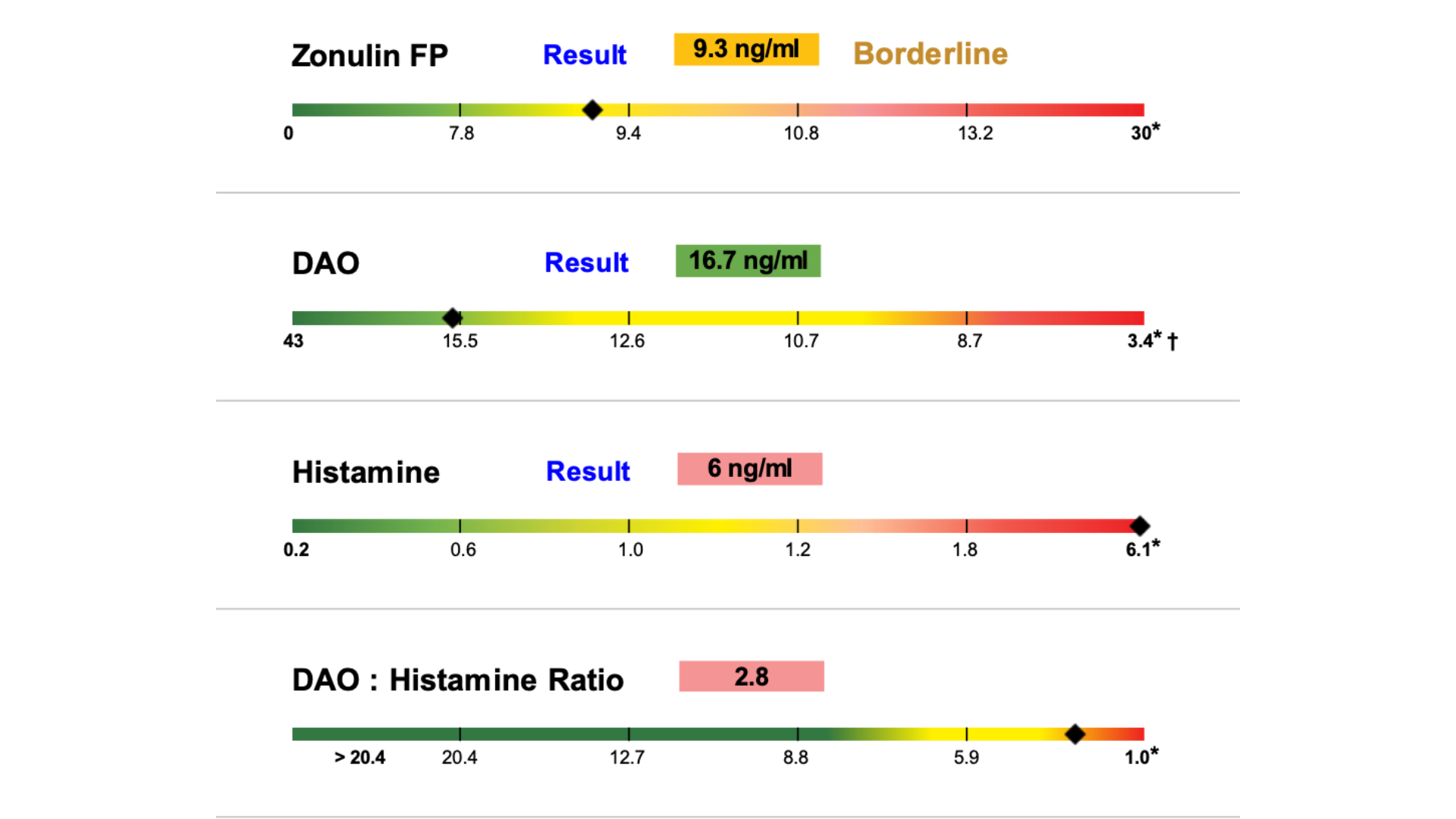 DAO: Histamine Ratio: Assesses the balance between histamine production and clearance. A low ratio indicates histamine overload relative to breakdown capacity.