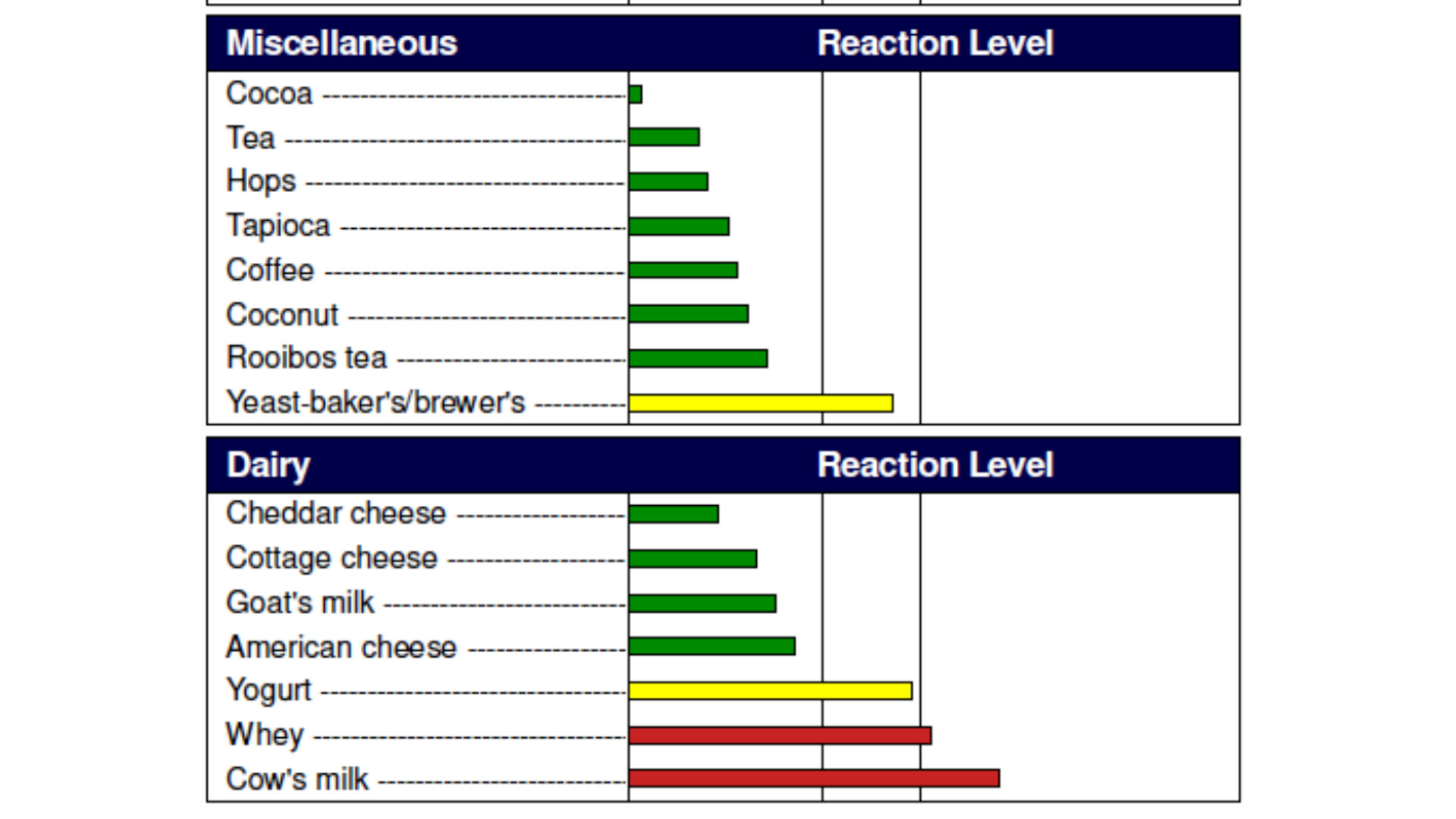 Inflammatory reactivity to 176 foods and chemicals across these categories. Each item is scored as low, moderate, or high reactivity, helping identify which foods may be fueling inflammation.